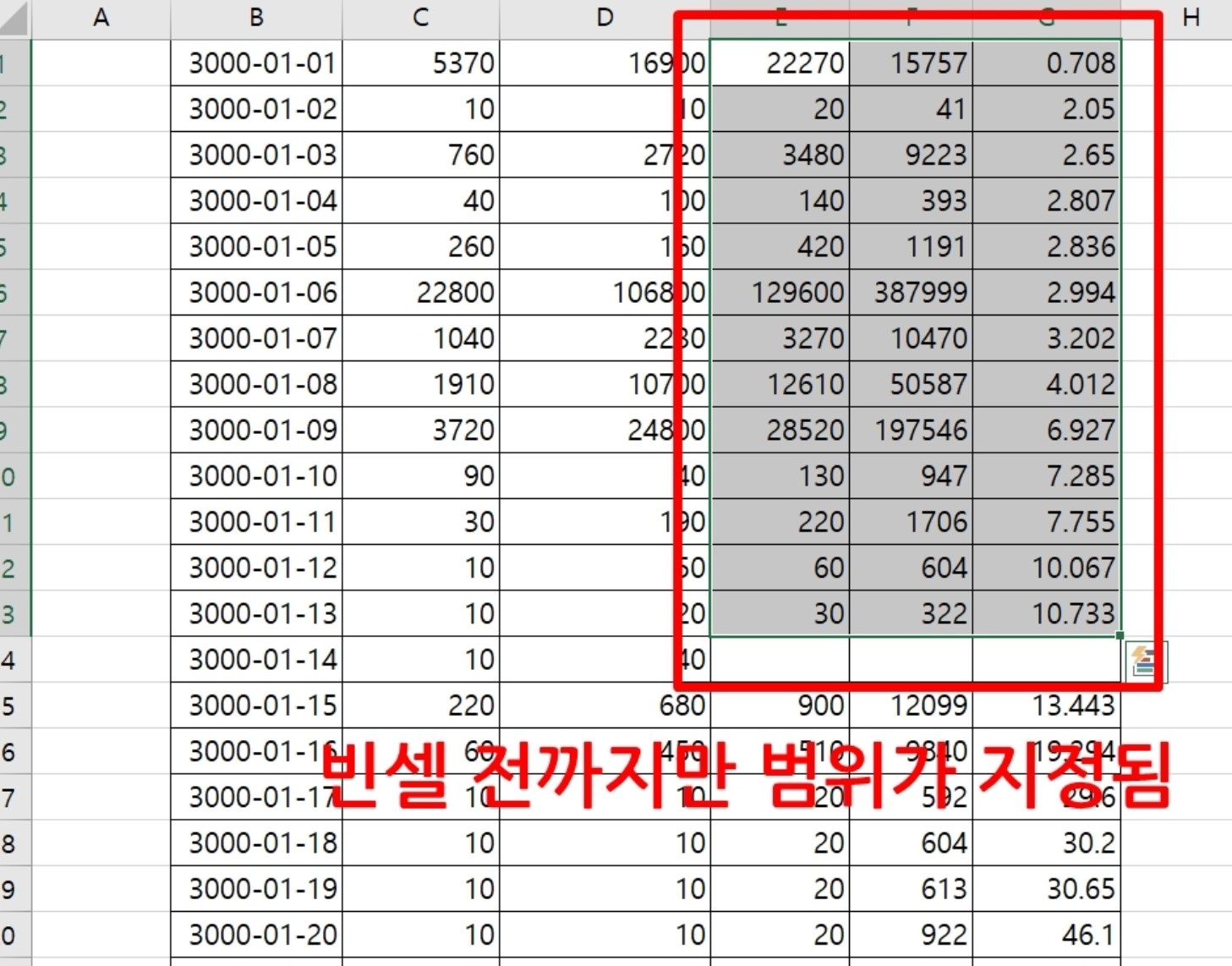 3. 공백이 있는 빈셀 전까지만 범위가 지정된 것을 확인할 수 있다.