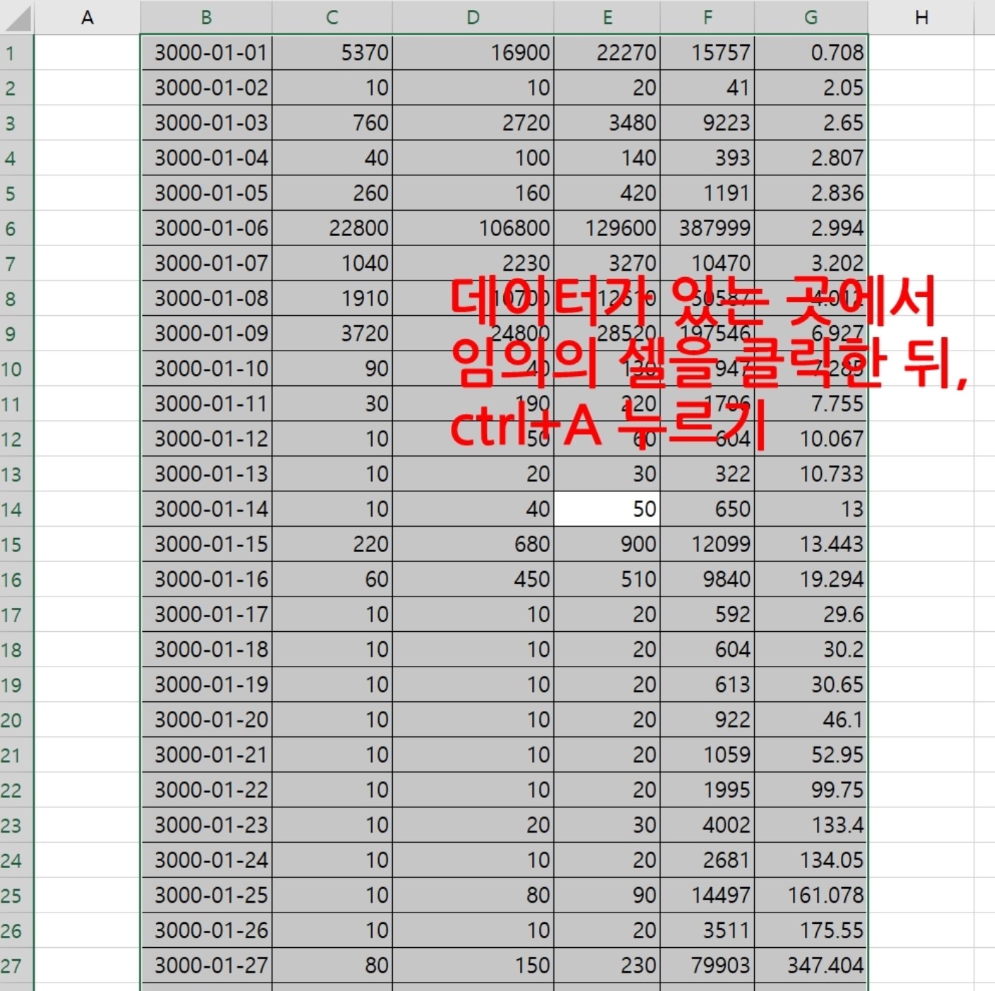 데이터가 없는 셀에서 Ctrl+A를 누르면?