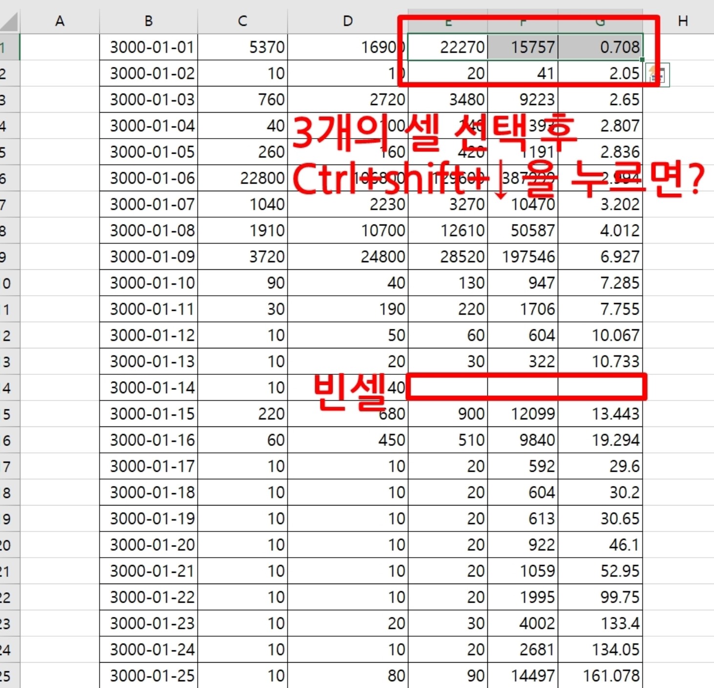 아래로 범위를 지정하고 싶으면 Ctrl + Shift + ↓을 누르고