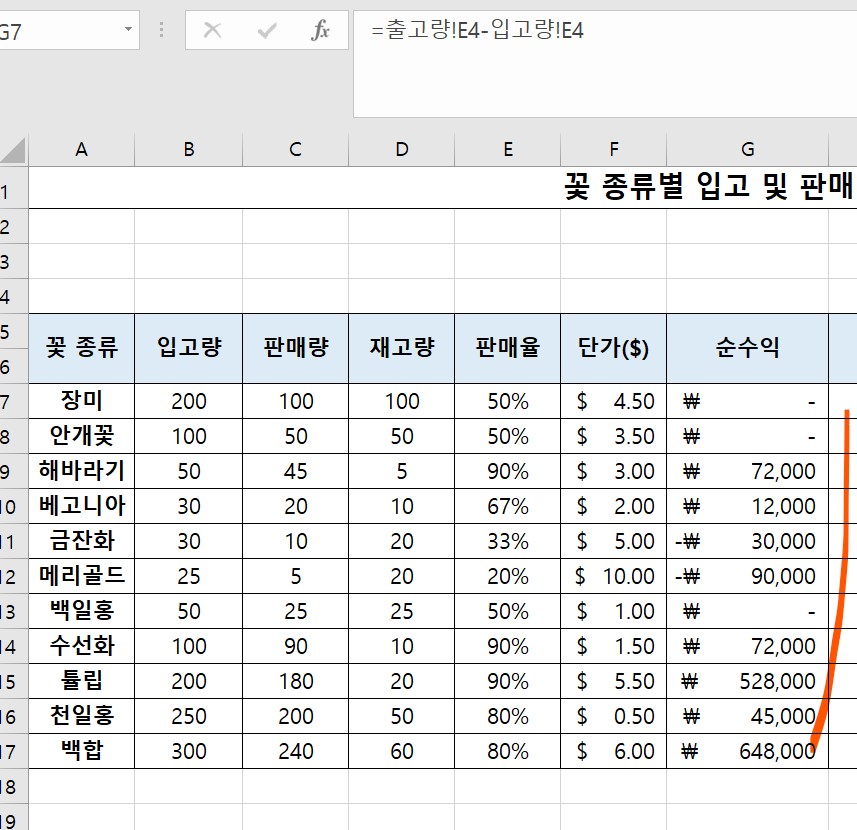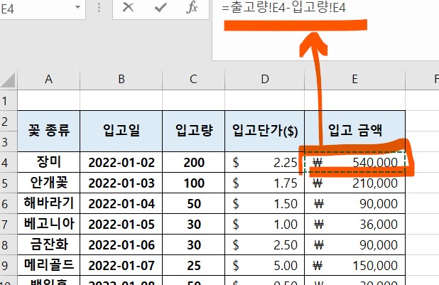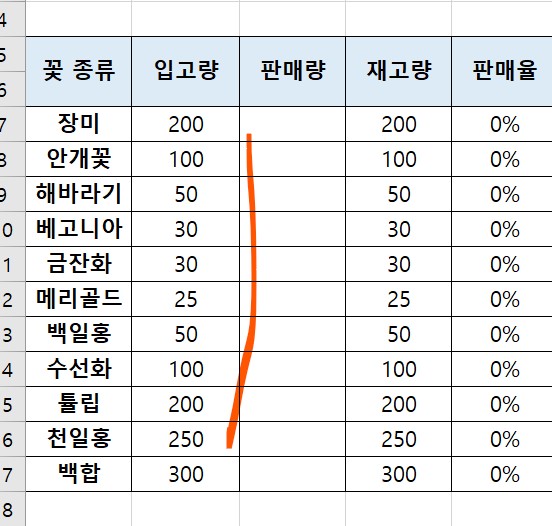 이미 다른 시트에 입고량과 판매량 데이터를 작성해두었다.