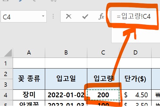 입고량시트에서 C4셀을 가져왔다는 의미.