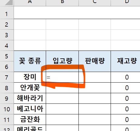 1. 입고량 셀을 클릭하고 등호(=)를 입력한다.