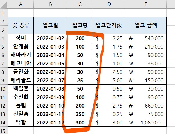 3. 입고량 시트에서 [입고량]의 첫 셀을 클릭한다.