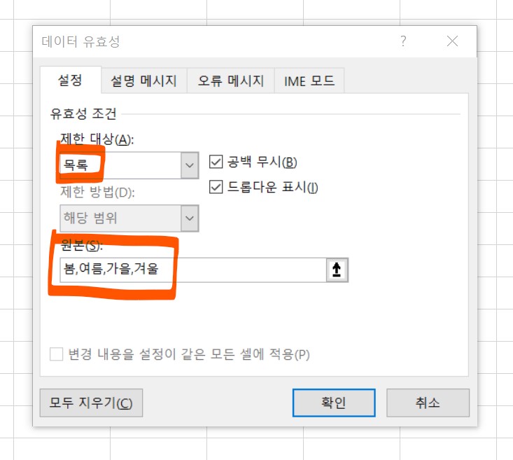 목록은 직접 입력해서 설정할 수도 있고, 이미 작성해놓은 리스트 범위를 정해서 설정할 수도 있다.