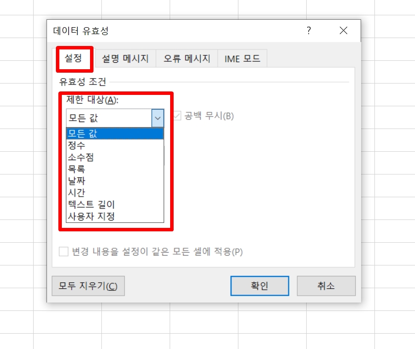 엑셀 데이터 유효성 검사 '설정'을 이용해서 다양한 대상을 설정할 수 있다.