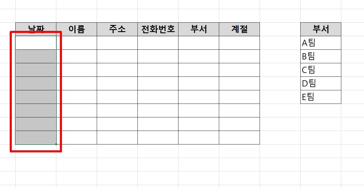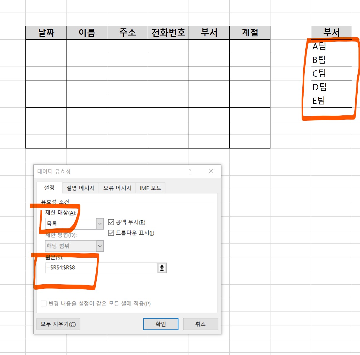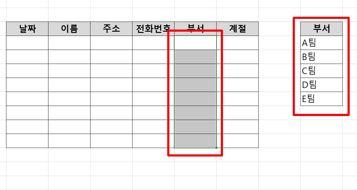 1. 부서 메뉴 아래에, 데이터 유효성 검사 목록을 지정하고자 한다.