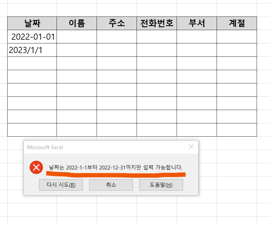 엑셀 데이터 유효성 검사 목록 & 날짜 & 오류메세지 설정하는 법