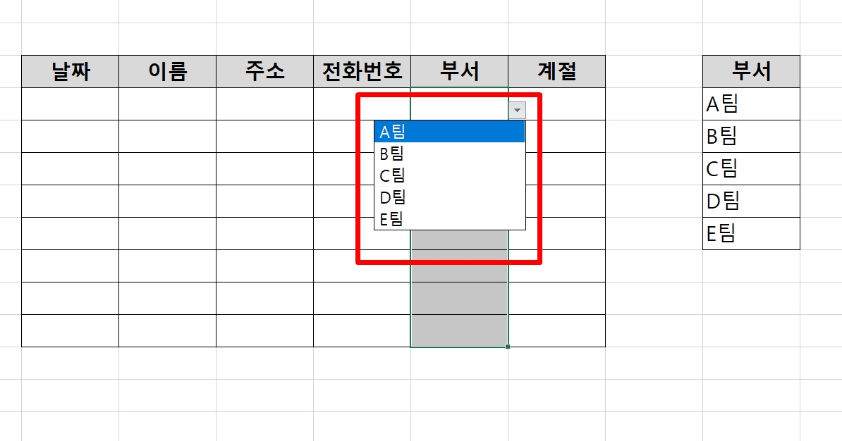 4. 부서명 아래 셀을 클릭하면, 부서명을 선택할 수 있도록 목록이 나온다.
