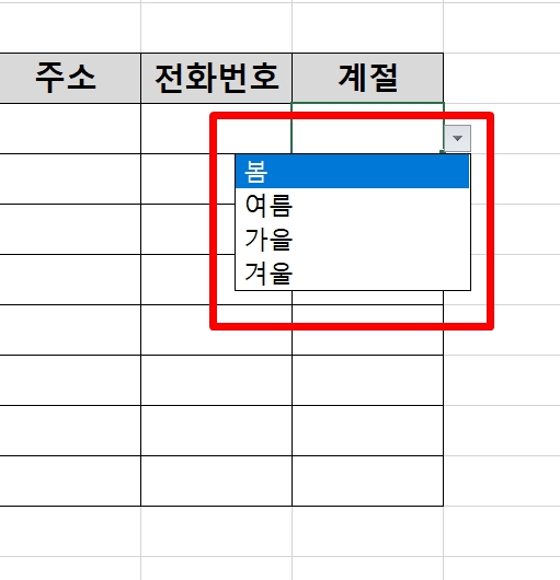 6. 계절 셀 아래 셀을 클릭하면, 화살표가 나온다.