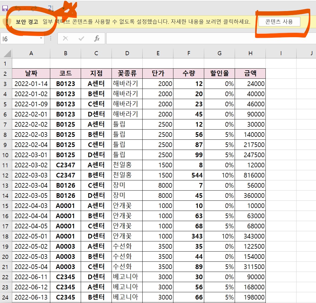 [콘텐츠 사용] 버튼을 누르니 노랑색의 보안경고 메세지가 사라졌다. 이제는 매크로가 적용 가능한 상태로 변경되었으니 작업을 편안하게 하면 된다.
