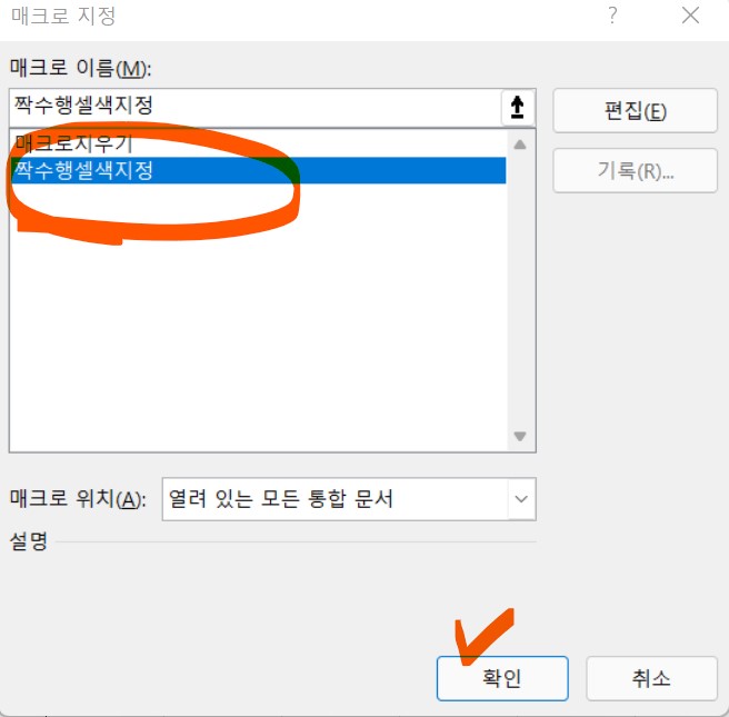 4. [매크로 지정] 창이 뜨게 되면, 매크로 목록에서 [짝수행셀색지정] 매크로를 클릭하고 [확인]을 눌러준다.