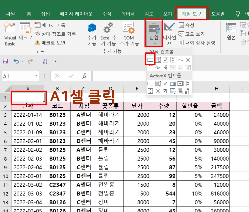 2. [개발도구] -> [컨트롤] -> [삽입]을 클릭한다. 그럼 아래에 [양식 컨트롤]이 나오는데, 거기에서 원하는 단추를 선택해주자. 이 포스팅에서는 첫번째 단추 모양을 선택했다.