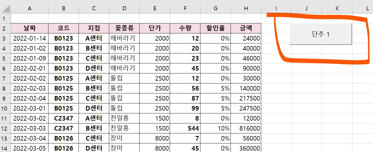 그럼 완성된 단추를 이용해서 데이터에 매크로를 적용해보겠다.