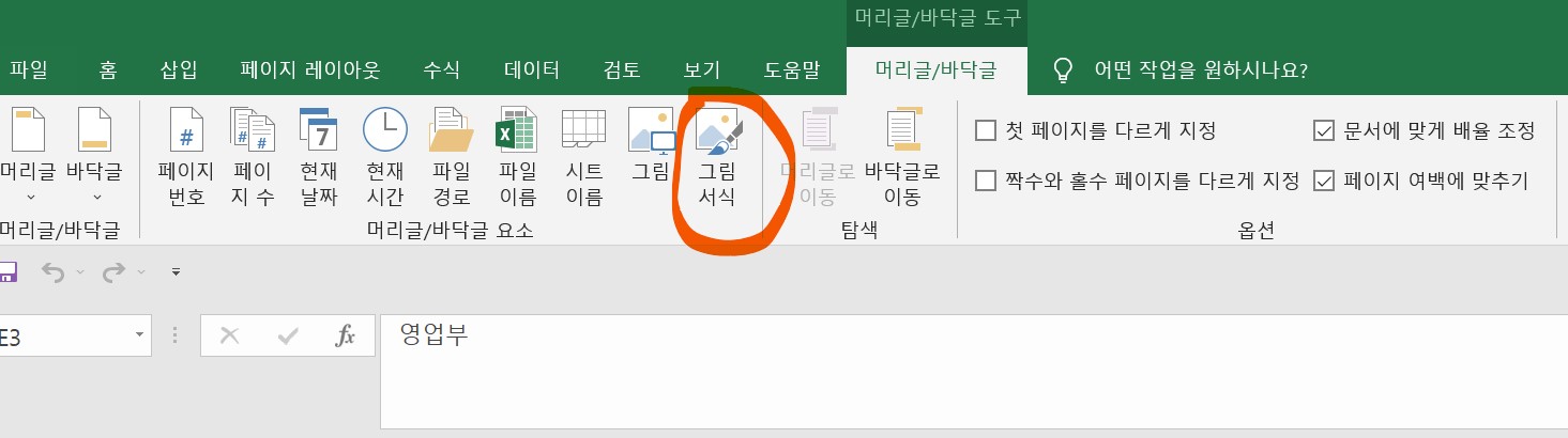 7. [머리글/바닥글]에서 [그림서식]을 클릭하자.
