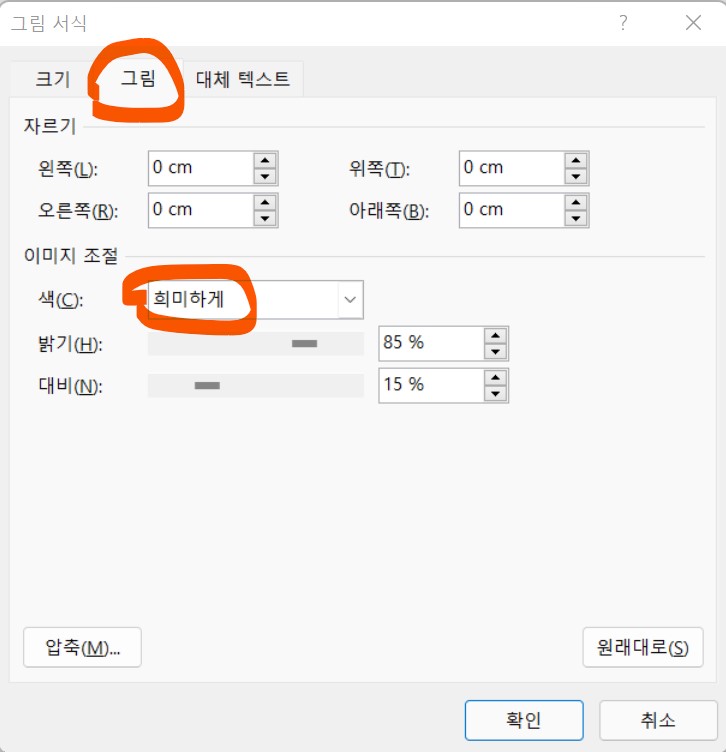 9. [그림]탭에서 [이미지조절] -> [색]을 [희미하게]로 선택해준다.