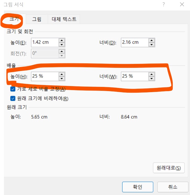 8. [크기] 탭에서 [배율]을 25%로 지정한다.