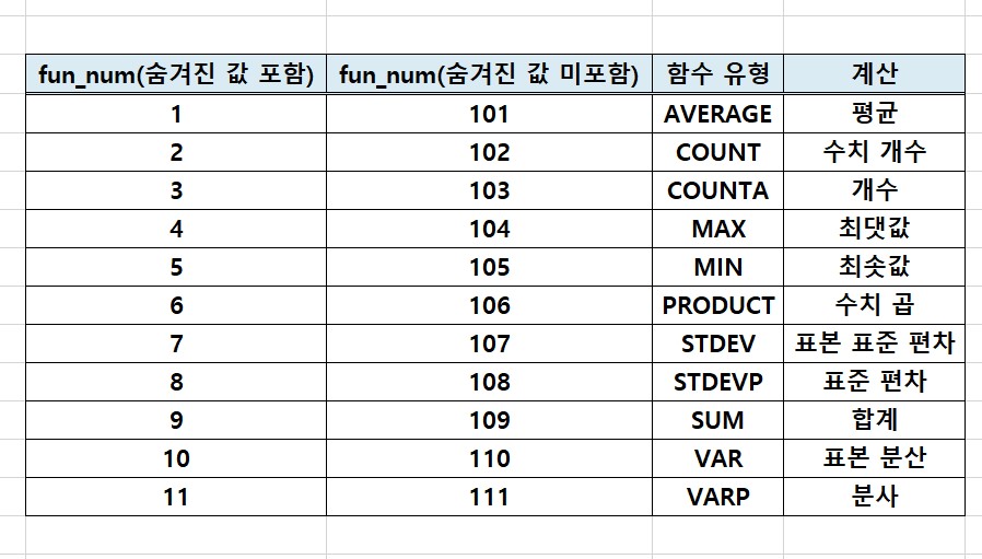 3. subtotal 함수의 함수번호에 대해 추가로 알아보려고 한다.