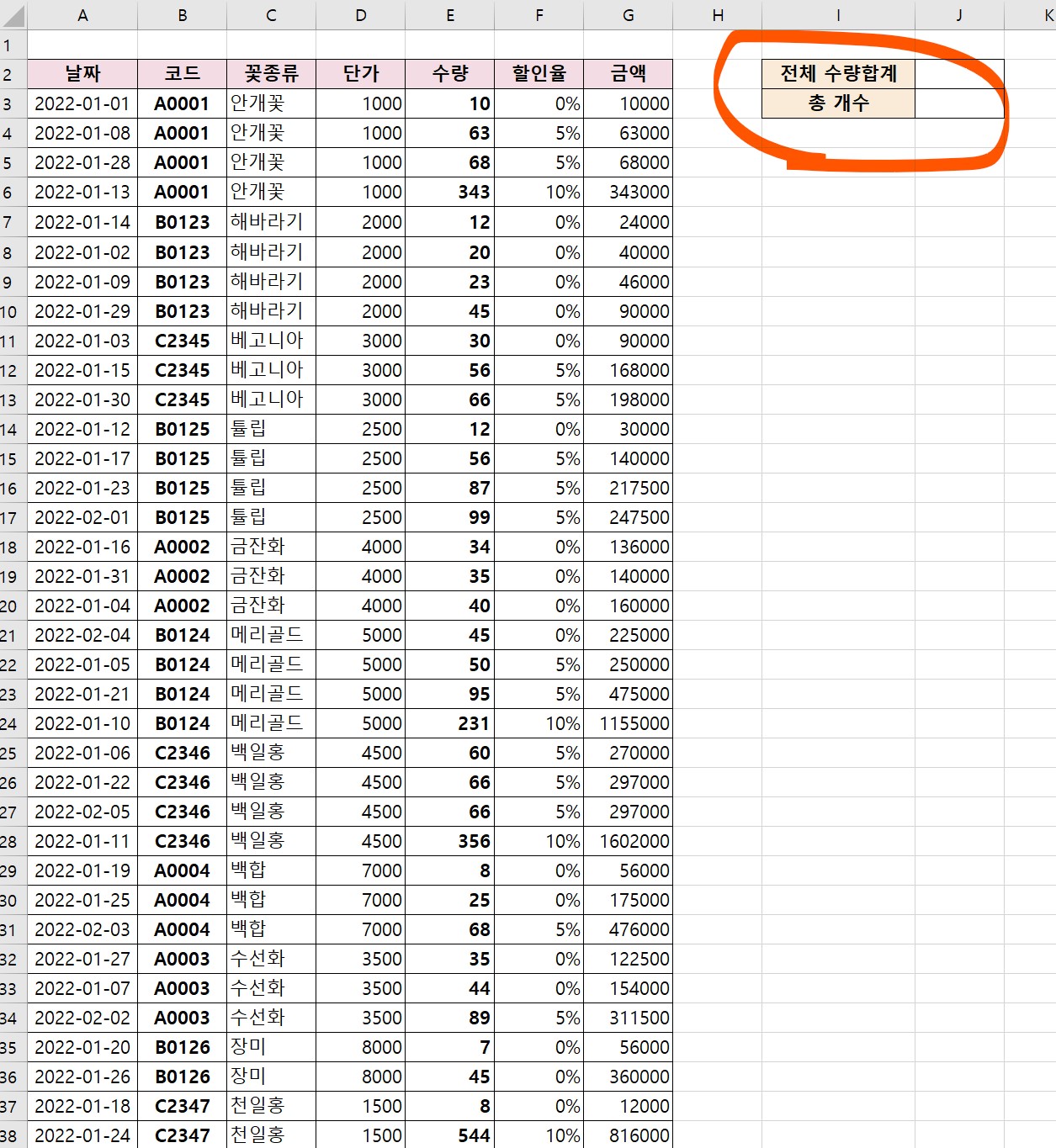 위의 표에서 수량의 전체 합계와 개수를 구해보려고 한다.
