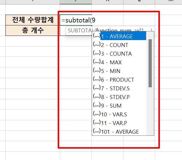 subtotal함수를 사용할때는 먼저 함수번호를 입력해야한다. 이 함수번호는 subtotal만 입력해도 밑에 자동으로 목록이 뜨게 되지만, 자주 사용하는 함수 번호는 미리 알아두면 편리하다.