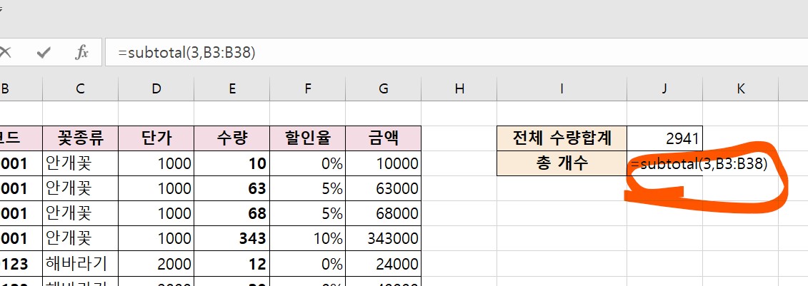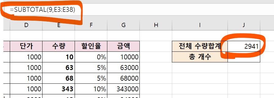 1. 수량합계를 구할 셀을 클릭하고, =SUBTOTAL(9,E3:E38) 을 입력한다.