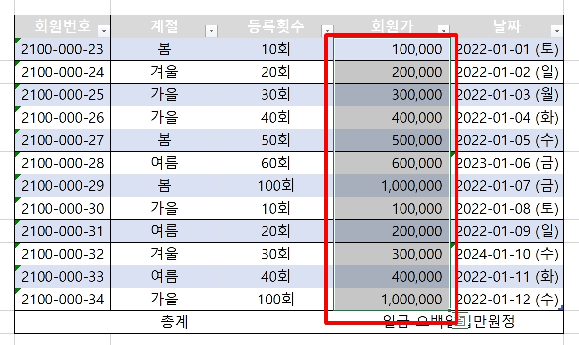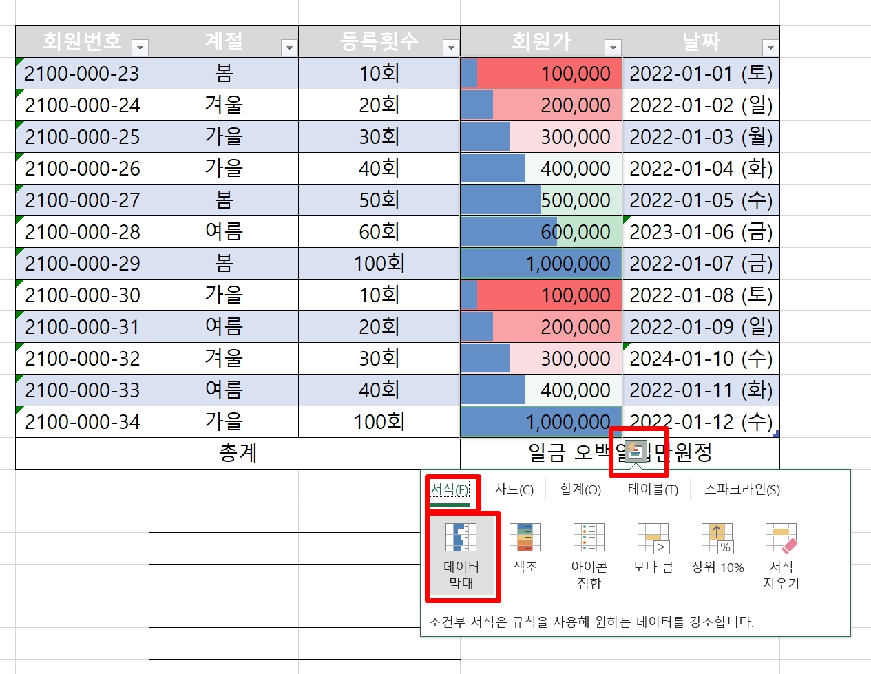 회원가 데이터 셀에 [데이터막대] 서식을 적용하려고 한다.
