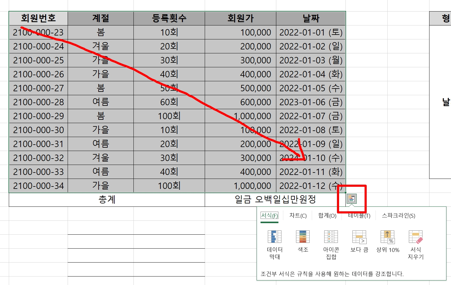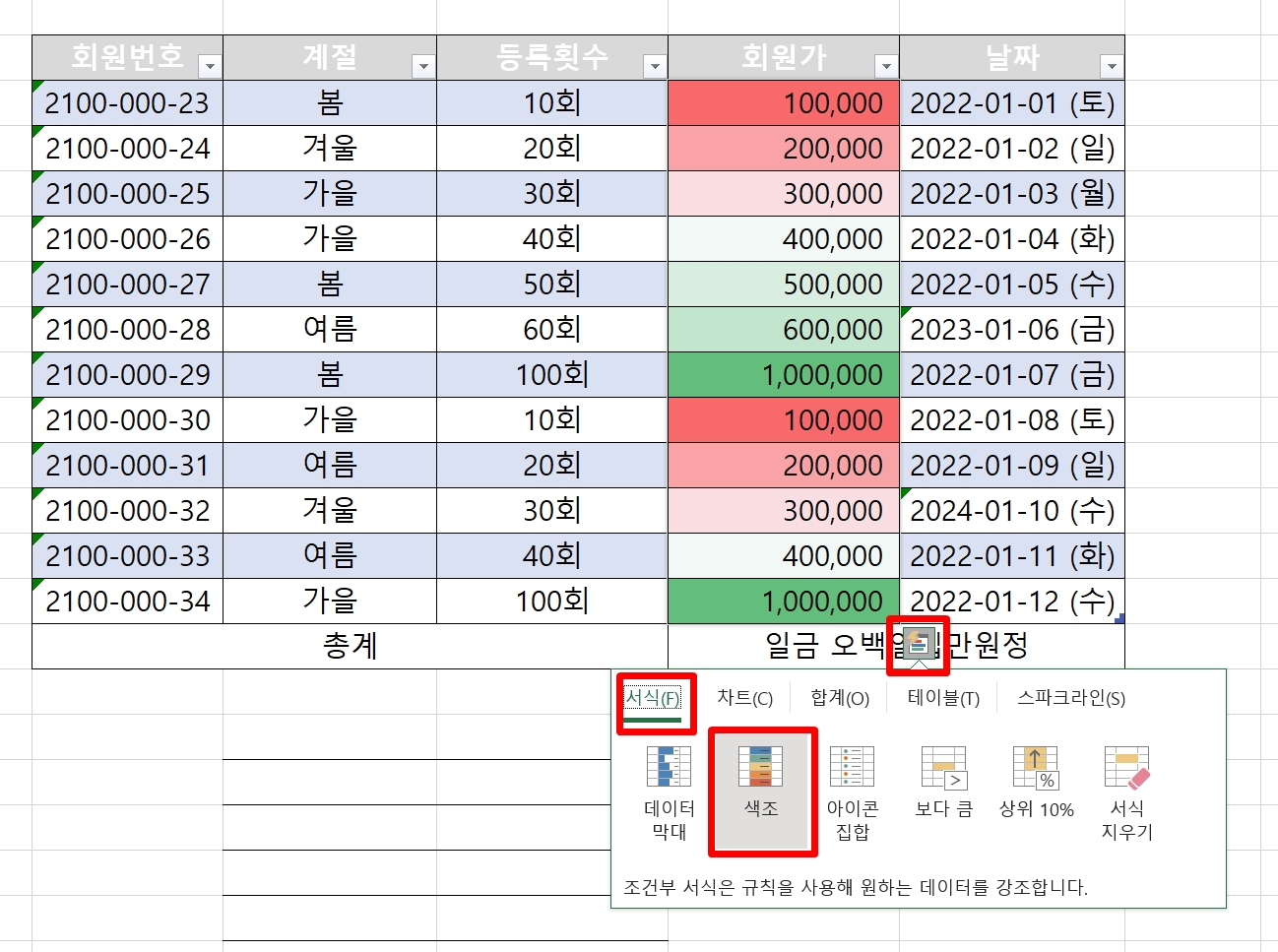 회원가 데이터 셀에 [색조] 서식을 적용하려고 한다.