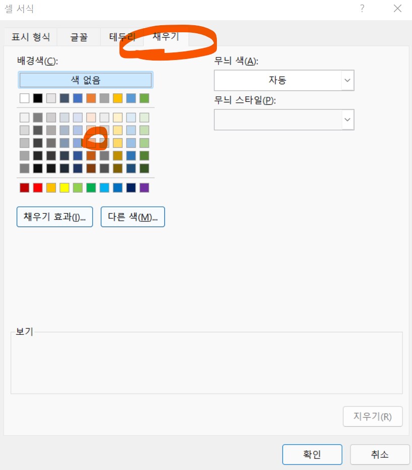 6. [서식]창에서 [채우기]를 클릭하고 원하는 색상을 선택한 뒤 [확인]을 누른다.