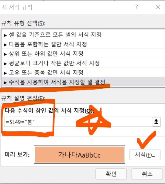 7. "봄"이 포함된 행 전체가 주황색으로 채워졌다.
