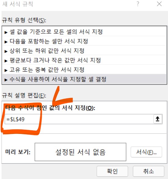 4. [규칙 설명 편집]에서 [다음 수식이 참인 값의 서식 지정]에 값을 입력한다.