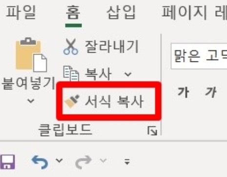 메뉴바 -> [홈] 탭 아래에 [서식복사] 아이콘이 있다.