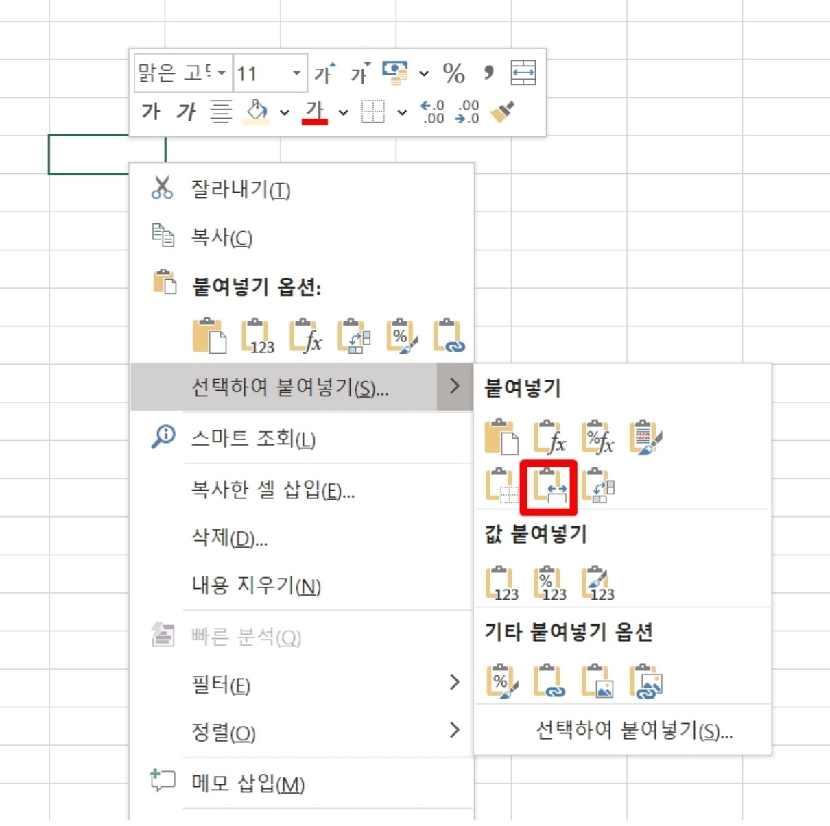 행과 열을 바꿔서 셀 내용과 서식, 수식을 붙여넣는 기능이다.