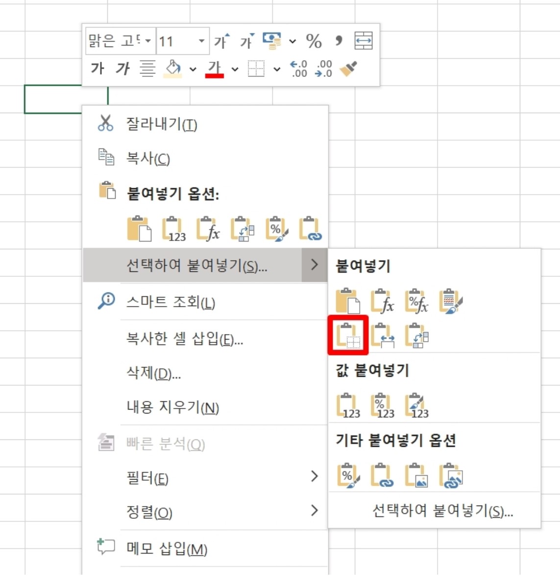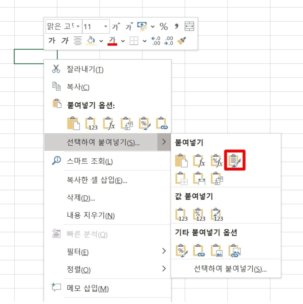 마우스 오른쪽버튼을 눌렀을 때, 붙여넣기 옵션 아래에 있는 선택하여 붙여넣기 옵션에 대해서 알아보고자 한다.
