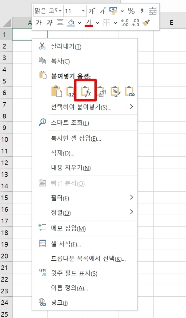 일반 붙여넣기 기능과 동일한 붙여넣기다. 기본 붙여넣기를 하려면 이걸 클릭하면 된다.