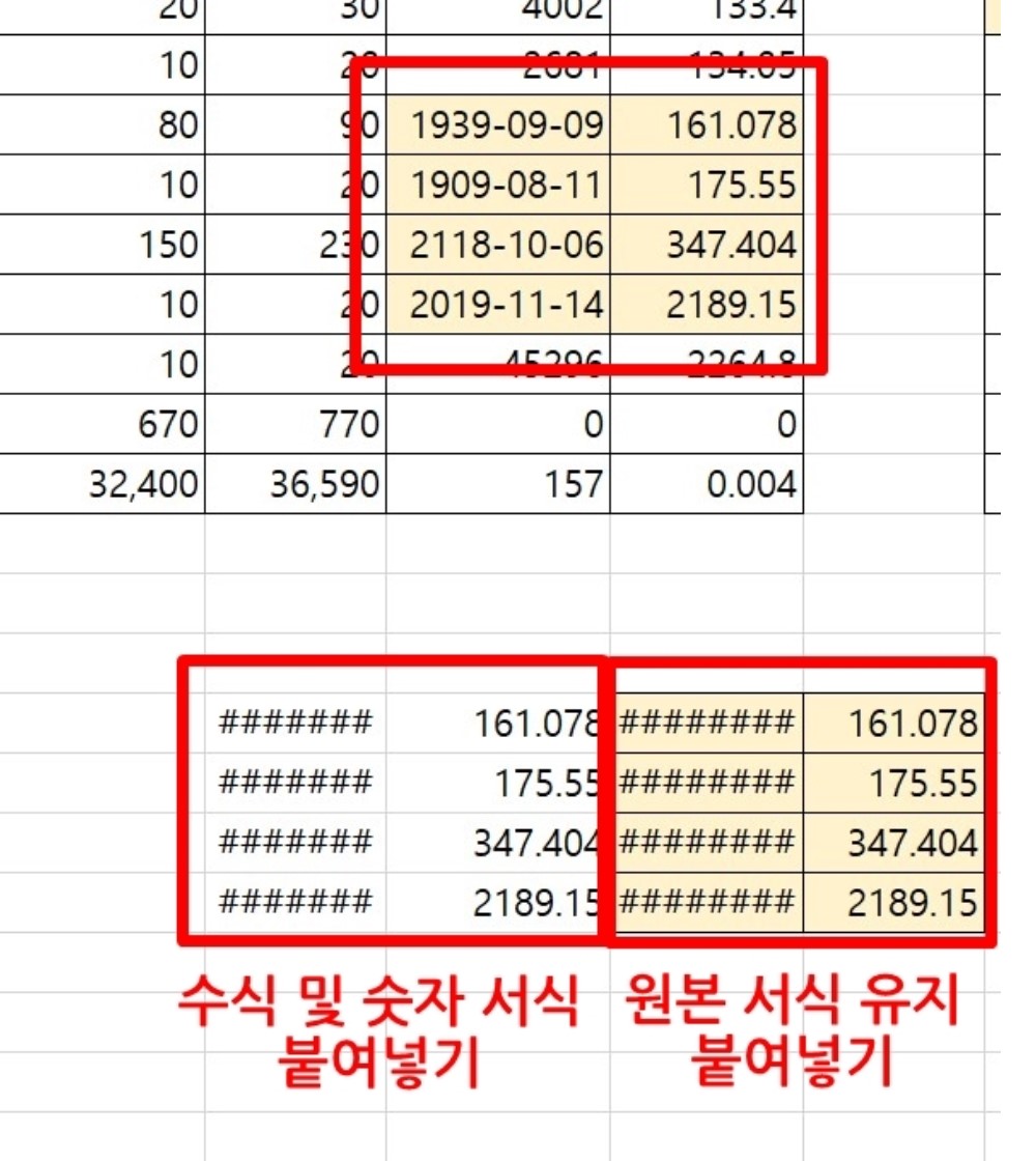 왼쪽이 4번. 수식 및 숫자 서식 붙여넣기라 노랑 배경이 복사되지 않았고