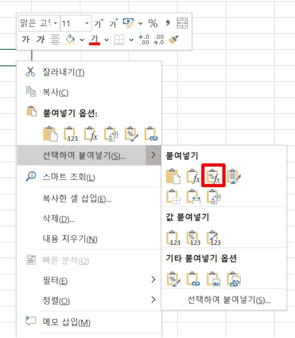 마우스 오른쪽버튼을 눌렀을 때, 붙여넣기 옵션 아래에 있는 선택하여 붙여넣기 옵션에 대해서 알아보고자 한다.