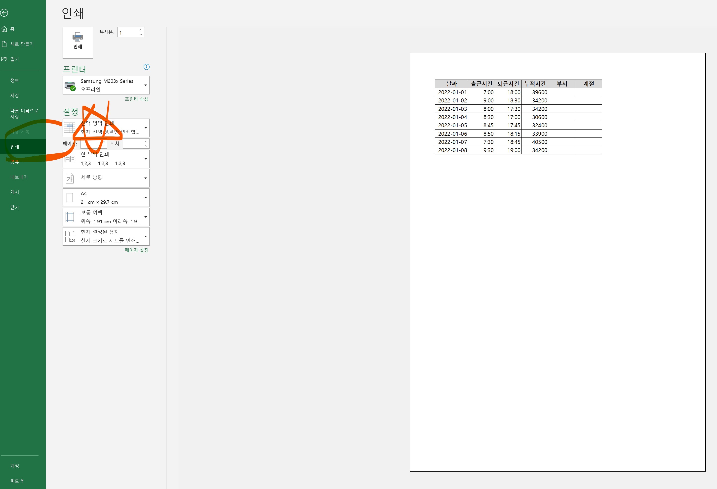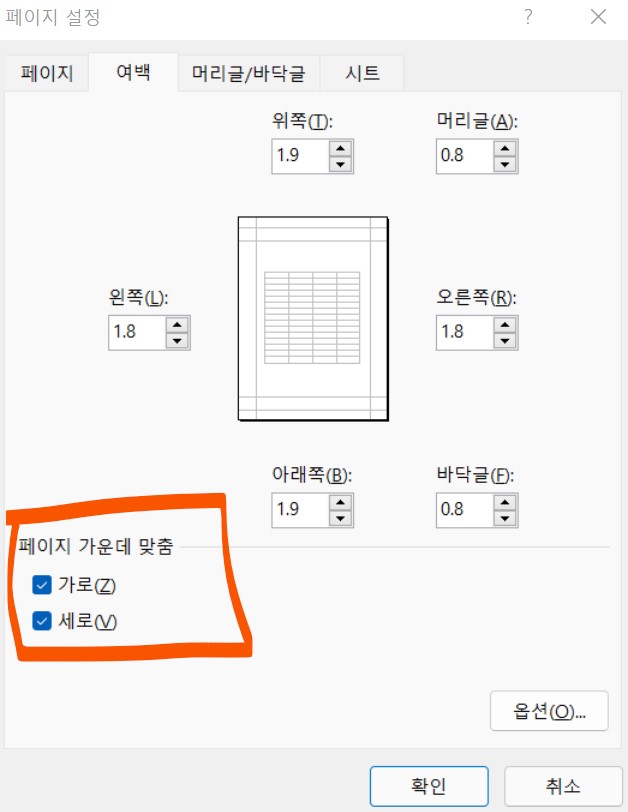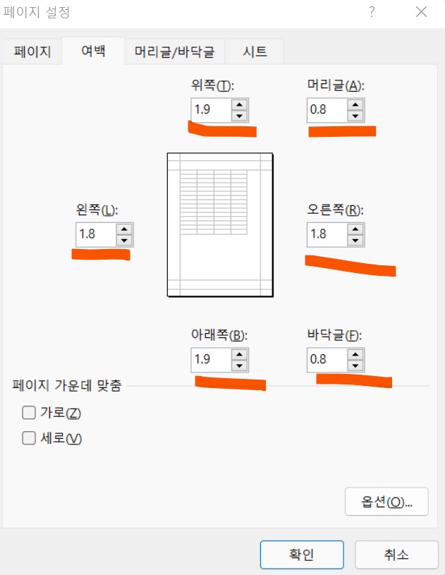 엑셀 선택 영역 인쇄 정렬 여백 설정