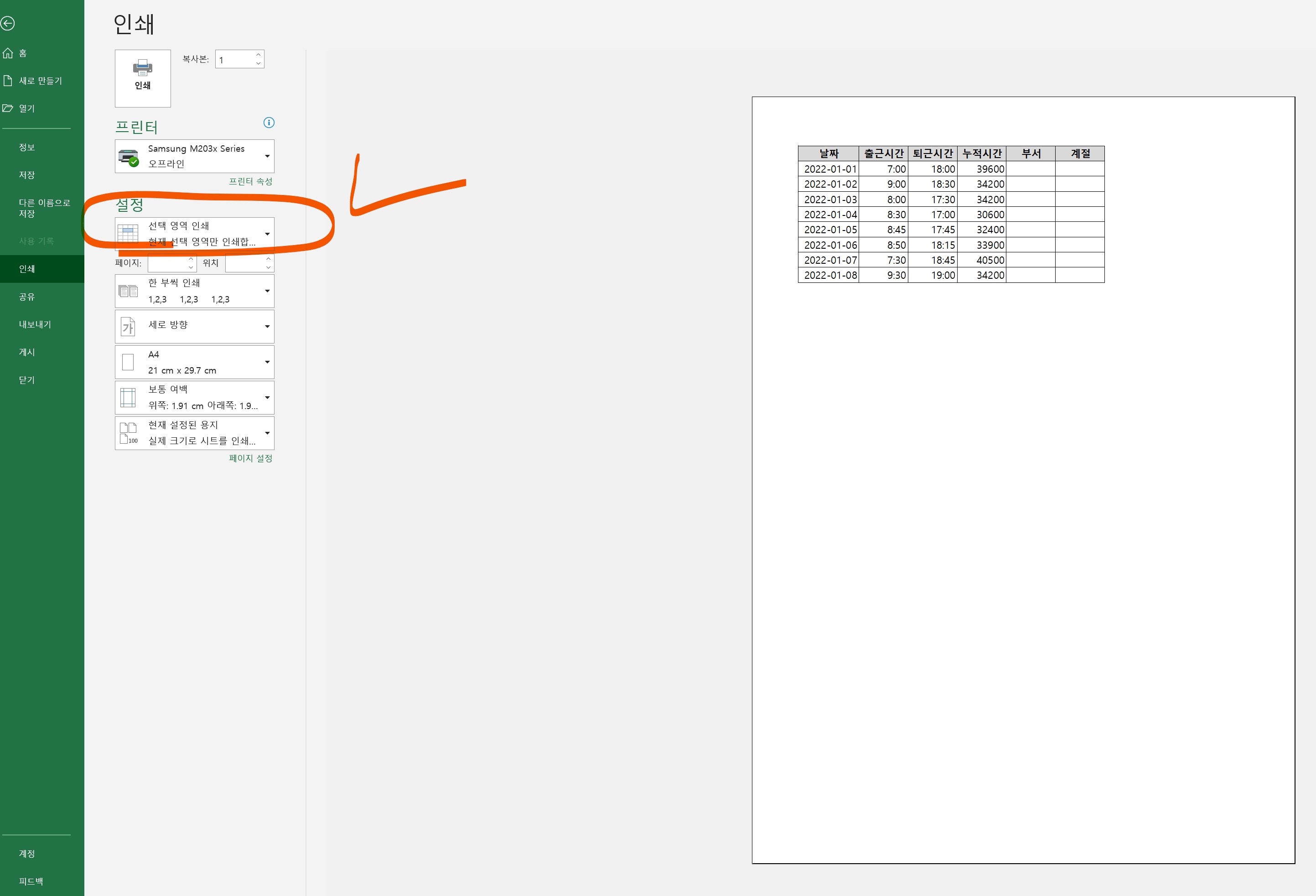 3. 프린트할 영역을 블락으로 지정했으므로 [설정]에서 [선택 영역 인쇄]를 클릭해준다.
