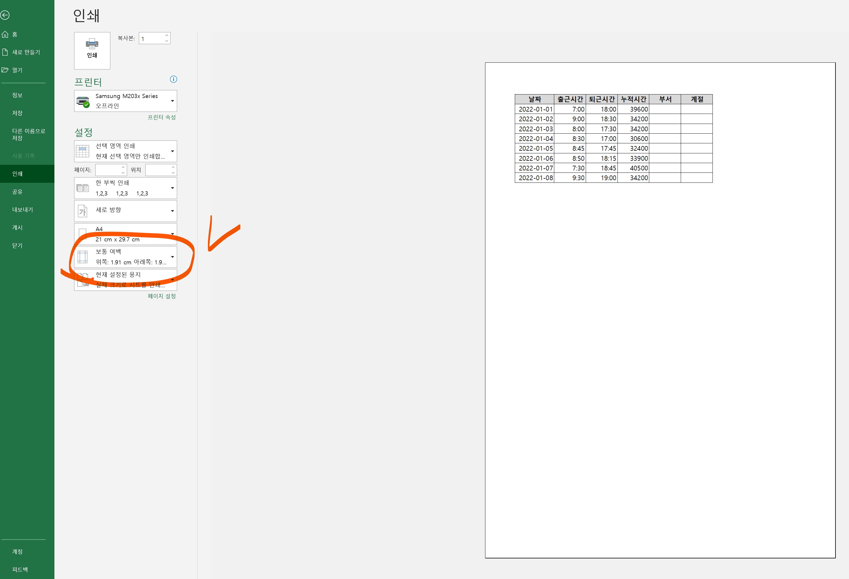 3. 인쇄 탭 내에서 여백을 설정해본다.
