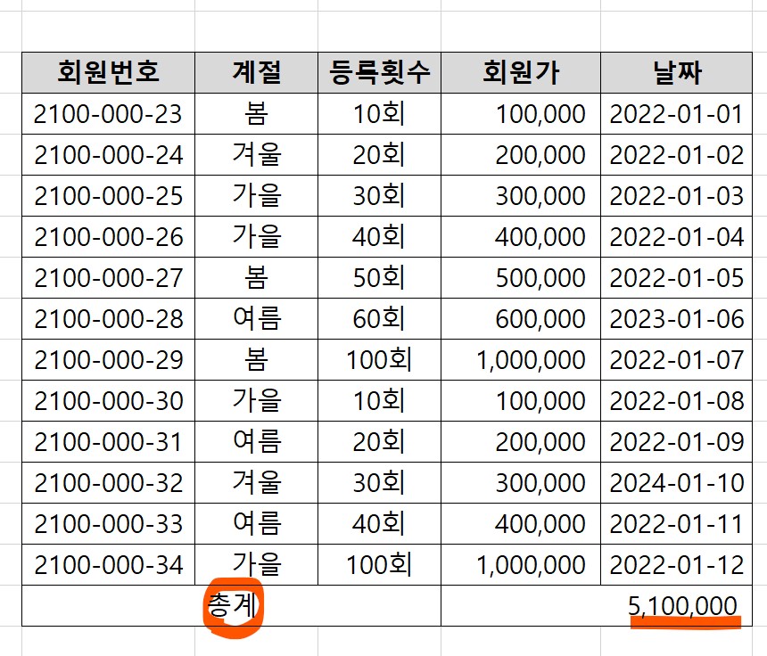 일단 회원가를 모두 더해 총계 셀 옆에 결과값을 내었다.