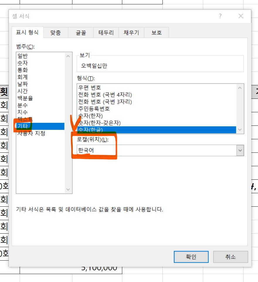 3. Ctrl+1 -> [셀서식] -> [범주] -> [기타] -> [형식] 숫자(한글) 클릭 -> [로캘(위치)] 한국어 클릭