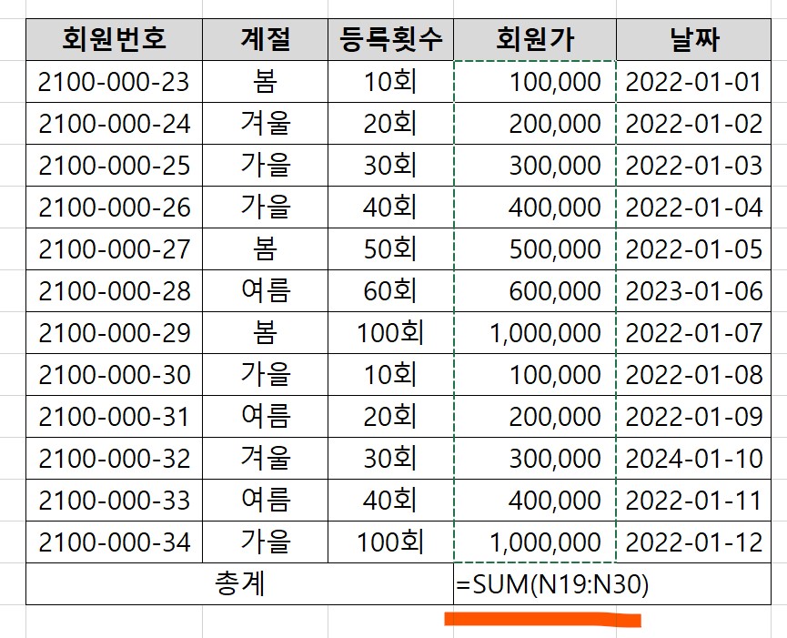 일단 회원가를 모두 더해 총계 셀 옆에 결과값을 내었다.