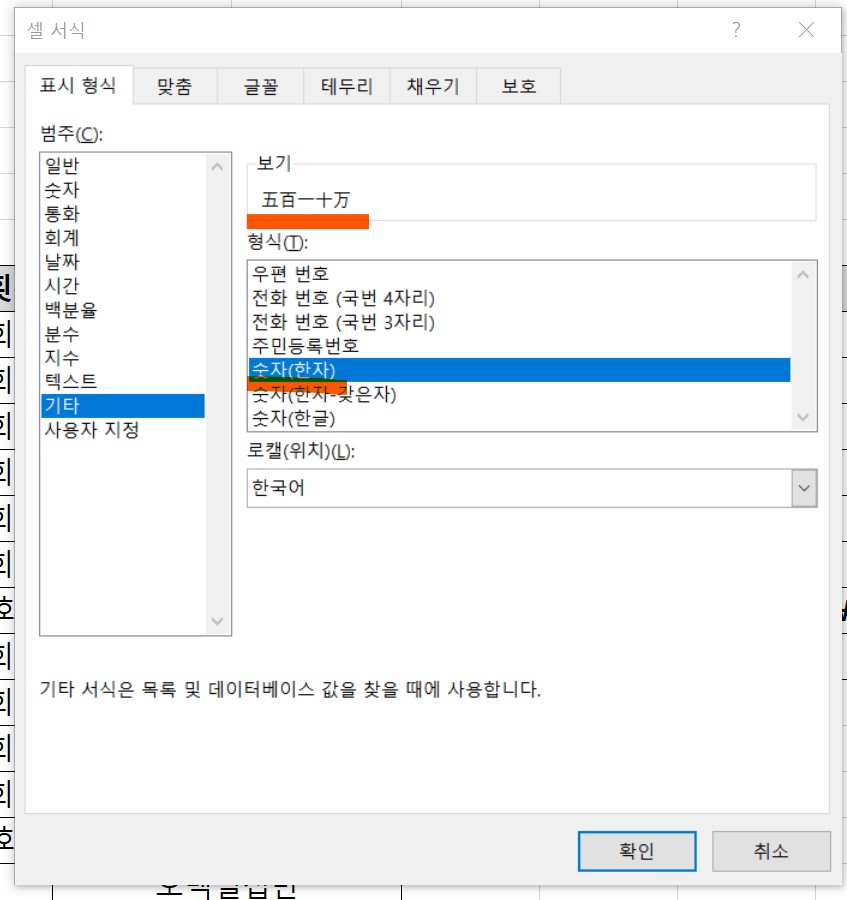 3. Ctrl+1 -> [셀서식] -> [범주] -> [기타] -> [형식] 숫자(한글) 클릭 -> [로캘(위치)] 한국어 클릭