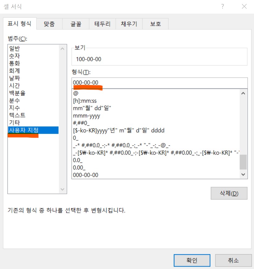 2. [마우스 오른쪽 버튼] -> [셀서식] -> [표시형식] -> [사용자지정] -> [형식] -> 000-00-00 을 입력한다.