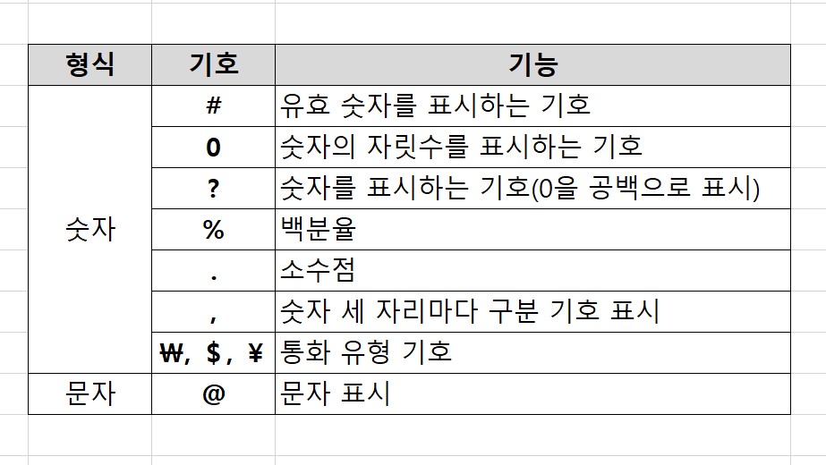 [셀서식]->[사용자지정] 기호 형식 알아보기