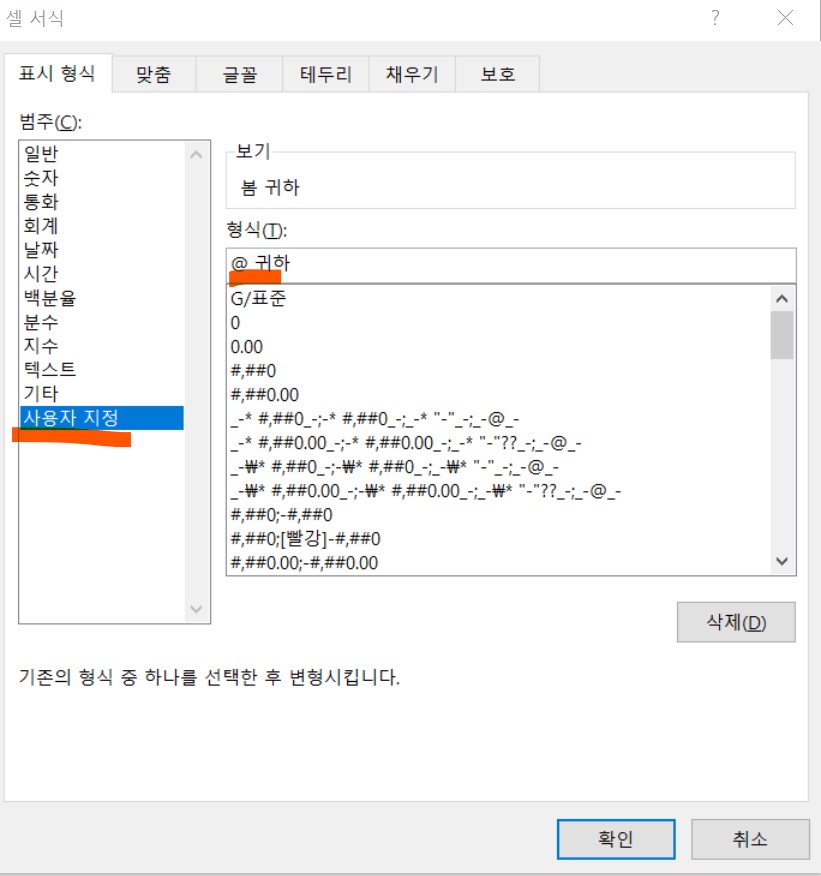 1. [마우스 오른쪽 버튼] -> [셀서식] -> [표시형식] -> [사용자지정] -> [형식] -> @ 귀하 를 입력한다.