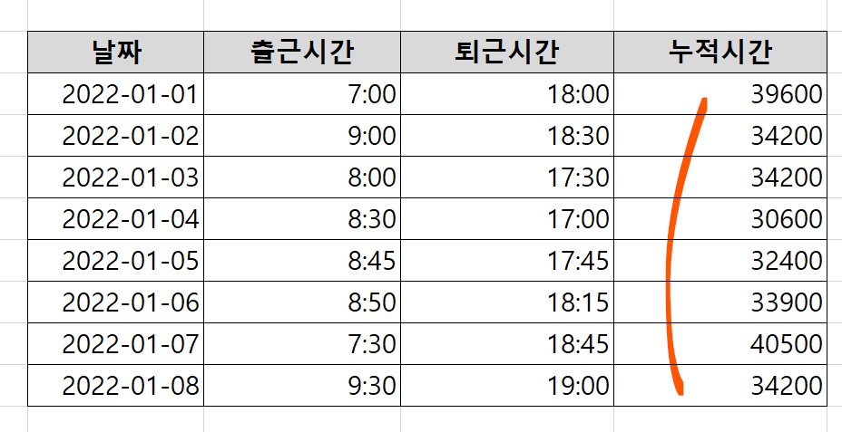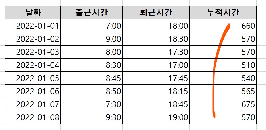 출퇴근시간이나 대여시간 등을 누적시간으로 표시하는 방법에 대해 먼저 알아보도록 하겠다.
