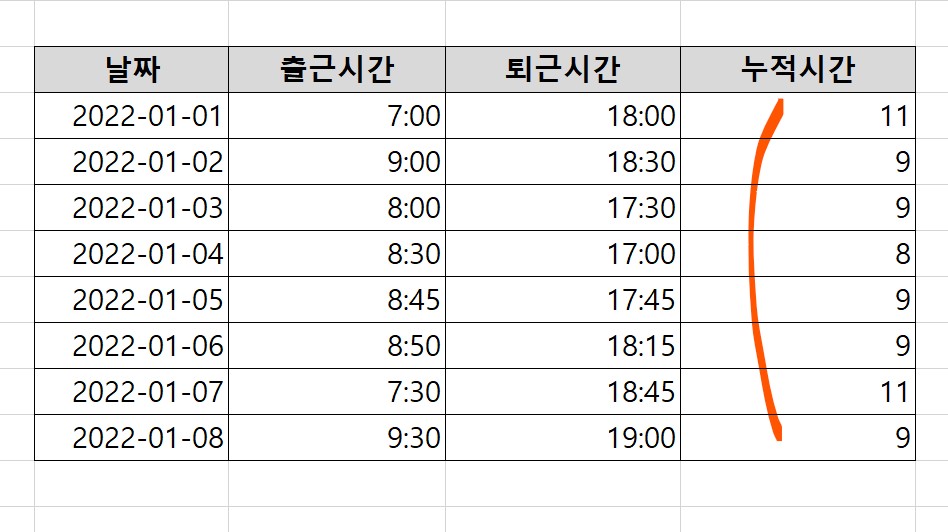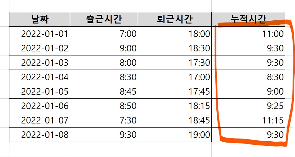 1. 먼저, 누적시간 메뉴 아래에 퇴근시간-출근시간을 적용한다.