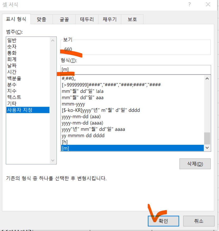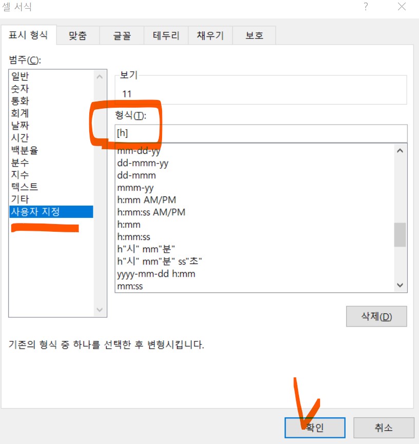 시간을 나타내는 건 3가지다. 이 3가지만 잘 활용해도 엑셀에서 서식코드를 이용하는데 무리가 없다.