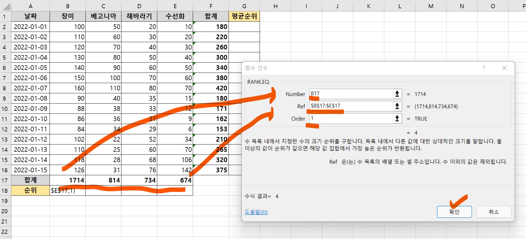 [Ref]에는 순위를 구할 때 참조할 범위를 입력한다 : $B$17:$E$17