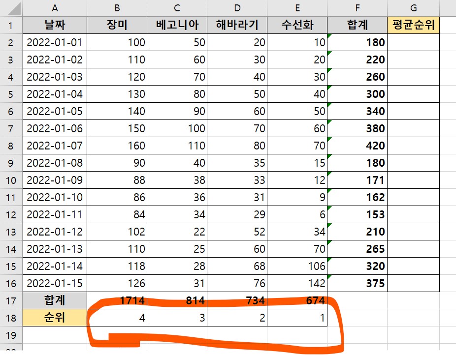 일단, RANK.EQ 함수는 꽃 종류별로 더해놓은 합계를 사용해 가장 많이 팔린것과 가장 적게 팔린 것의 순위를 알아보도록 하겠다.